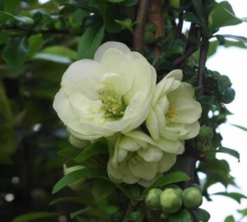Описание: кустарник раскидистый. Листья темно-зеленые, блестящие, при распускании красноватые. Цветки крупные, белые или кремово-белые, махровые. Цветение в V. Плоды яблоковидные, 5-8 см в диаметре, твердые, желтые, созревают в IX-X.