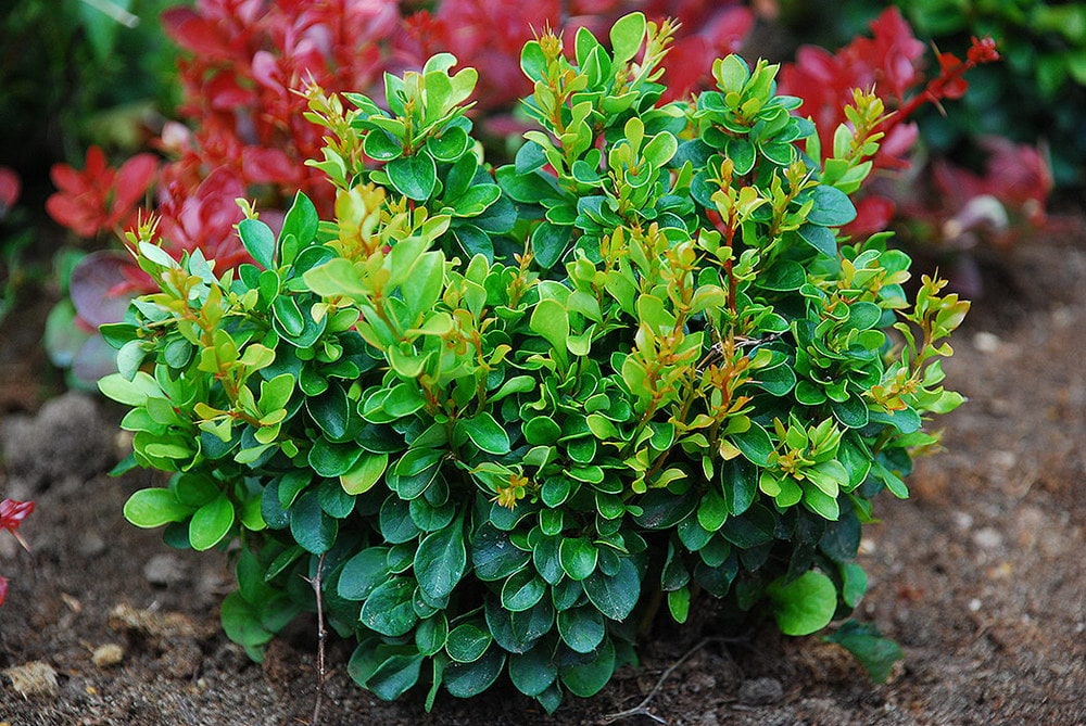 Описание: карликовый сорт с очень плотной округлой формой кроны. Листья мелкие, до 1,5 см длиной, темно-зеленые, при распускании розоватые, к осени становятся насыщенно-красного цвета. Обильно цветет и плодоносит. Растет медленно.