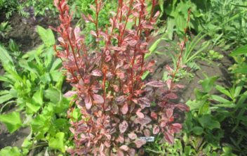 Описание: колючий колоновидный кустарник с вертикально растущими крепкими побегами коричнево-серого цвета. Листья обратнояйцевидные, слегка сужены к основанию, изящные, небольшие, при распускании розовые, затем бордового цвета, к началу лета появляются многочисленные розовые пятнышки, так что в целом куст кажется розовым.