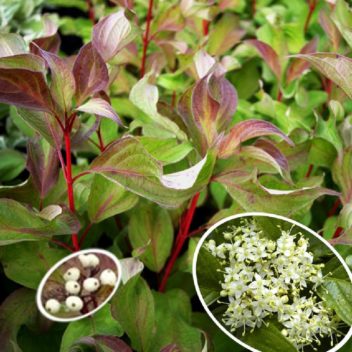 Описание: компактный кустарник с округлой плотной кроной, молодые побеги ярко-красные. Листья зеленые, с волнистым краем, позволяющим видеть голубоватую нижнюю поверхность листа, осенью пурпурно-красные.