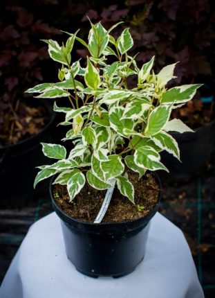 Описание: кустарник средних размеров, похож на сорт «Elegantissima», отличается более яркой и широкой каймой на темно-зеленой, морщинистой, более жесткой листве и меньшей скоростью роста, размерами, фиолетовой осенней окраской и яркой, насыщенно-кораллово-красной зимней окраской коры молодых побегов. Плодоношение слабое.