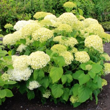 Описание: компактный сорт с шаровидной формой кроны. Побеги довольно прочные, в молодом возрасте зеленого цвета, по мере одревеснения становятся светло-коричневыми. Листья крупные, ярко-зеленые. Соцветия пышные, шаровидные, до 25-35 см в диаметре, состоят из крупных 4-лепестковых стерильных цветков, плотно прижатых друг к другу. При распускании цветки имеют легкий зеленовато-белый оттенок, а в полном роспуске ослепительно белые. Цветет обильно и продолжительно в VI-VIII.