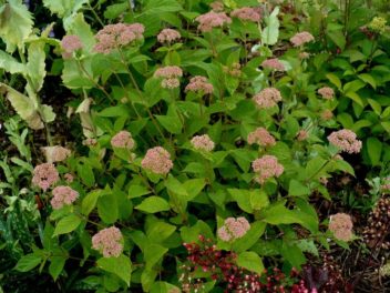 Описание: раскидистый куст с округлой формой кроны и многочисленными побегами. Листья изумрудно-зеленые, яйцевидной формы, осенью становятся зелено-желтыми. Соцветия до 10-15 см, плоскоокруглые и состоят в основном из фертильных цветков, с редким вкраплением стерильных, с нежным, едва уловимым ароматом. Цветет в VI-VIII. В начале цветения бутоны розовые, затем окраска меняется на белую, к концу приобретает сиреневые тона. В полном роспуске плодущие цветки очень пушистые, а редкие стерильные – придают неповторимое очарование и элегантность.