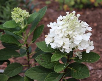 Описание: компактный куст. Побеги сильные. Соцветия длиной до 15 см, цветки белые, осенью розовеют. Цветения с VII до заморозков. Листья темно-зеленые.