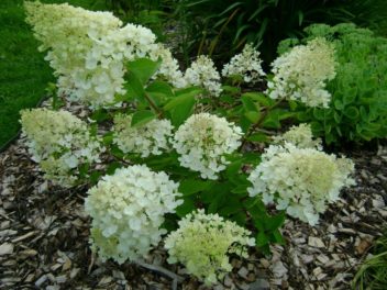 Описание: карликовый сорт с очень плотной, округлой, компактной кроной и многочисленными красно-коричневыми побегами. Листья темно-зеленые, крупные, правильной яйцевидной формы, с заостренной вершиной. Цветение обильное и продолжительное с VII до середины IX. Цветки стерильные, белого цвета, к концу цветения розовеют. Соцветия плотные, широкопирамидальной формы.