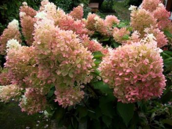 Описание: куст с округлой раскидистой кроной. Побеги сильные, крепкие, слабо разветвленные, растут вертикально, красно-коричневого цвета. Листья зеленые, продолговатые, узкояйцевидной формы. Соцветия очень крупные, длиной 30-40 см, на хорошем агрофоне достигают 50-60 см. Соцветие дробно-конической формы с выступами, состоит из белых стерильных цветков, к осени приобретающих сиреневато-розовый оттенок. Цветет в VII-X. Осенью листья приобретают желтые тона, а соцветия сохраняют форму и могут использоваться в качестве сухоцветов.