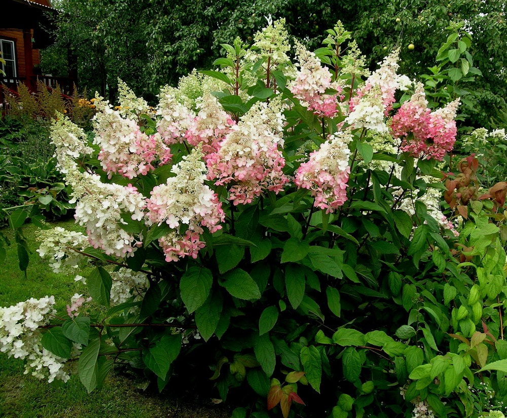 Описание: куст с округлой вазообразной формой и прочными побегами темно-вишневого цвета. Листья яркие, зеленые, удлиненной яйцевидной формы, сидят на красных черешках. Соцветие крупное, с преобладание стерильных цветков. Зацветает белыми цветками, которые затем окрашиваются в интенсивный темно-розовый цвет. Соцветие конусообразное с широким основанием, длиной 25-35 см. Цветет обильно в VIII-X, не теряет декоративности поздней осенью.