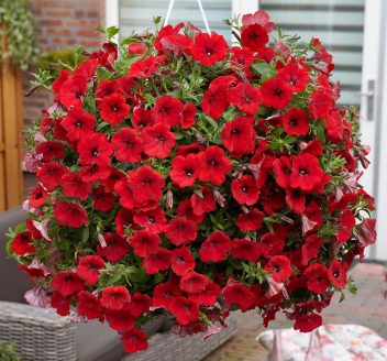 Сурфинии - сортосерия ампельных петуний, завоевавшая небывалую популярность по всему миру благодаря своим исключительным качествам. У сорта 'Дип Ред' (Глубокий красный) густоту кроваво-красного цвета усиливает тёмное горлышко.