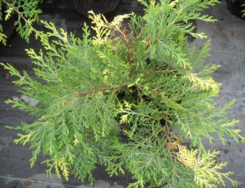 Декоративный раскидистый низкий кустарник для тенистых мест. Внешне напоминает стелющиеся формы туи. Хвоя зелёная с кремовыми пятнами, при растирании с лёгким запахом. Осенью становится коричневой, с крупными сливочно-желтыми пятнами. Рекомендуется для каменистых садов, для декорирования склонов, бордюров. Зона USDA 3. Форма кроны: распростертая. Окрас хвои: зелёная с кремовыми пятнами.