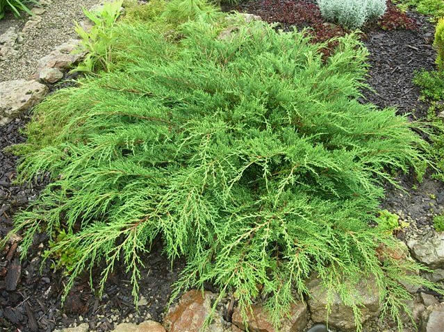 Компактный хвойных кустарник с распростертой кроной и приподнятыми, вертикально растущими ветвями. Растет медленно, из-за этого сохраняет карликовую форму на долгое время. В процессе роста побеги изгибаются дугообразно. Хвоя плотно прилегающая, летом зеленая, с наступлением холодов буреет. Ветви упругие, выдерживают тяжесть мокрого снега. Теневынослива. Рекомендуется для каменистых садов, для декорирования склонов, бордюров. Зона USDA 3. Форма кроны: распростертая. Окрас хвои: зелёная.