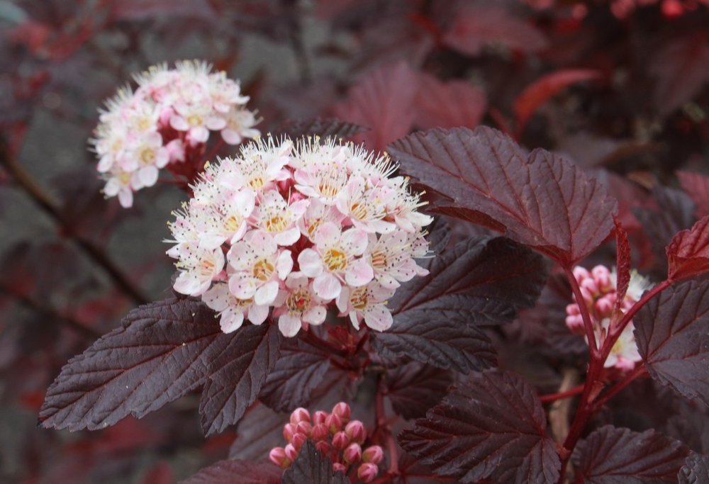 Описание: компактный кустарник с плотной кроной. Листья глубоко надрезанные, при распускании красивой медно-оранжевой окраски и пурпурные летом. Цветет обильно бело-розовыми цветками.
