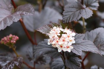 Описание: кустарник с раскидистой плотной кроной, с темными, равномерно окрашенными пурпурными листьями, не меняющими свой цвет в течение всего сезона. Цветки в бутонах розовые, при распускании белые, собраны в полушаровидные соцветия, декоративно смотрятся на фоне пурпурной листвы. Плоды – ярко-малиновые листовки. Наиболее интенсивная окраска листа проявляется на солнечном месте, в тени листья зеленеют.