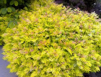 Описание: компактный густой кустарник. Листья декоративные, весной розово-красные, позже зеленеют. Цветки кремово-белые, в некрупных соцветиях, цветет необильно в конце VI – начале VII.