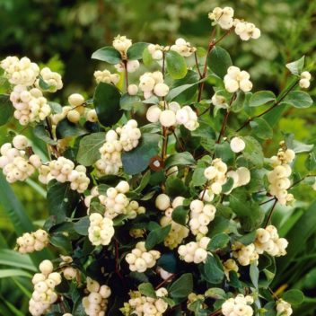 Описание: кустарник широкораскидистый. Листья темно-зеленые, супротивно расположенные, эллиптические, ближе к осени немного желтеют. Цветки маленькие, розово-белые колокольчики, собраны в кистевидные соцветия, зацветают в VI. Плоды белые, большие, круглые, собраны в гроздья, созревают в сентябре и сохраняются на кусте до весны.