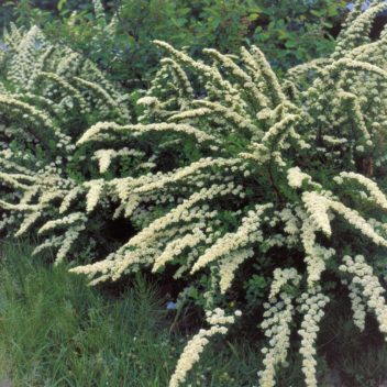 Описание: широкораскидистый кустарник с очень густой округлой кроной и изящно изогнутыми ветвями. Листья темно-зеленые, сохраняют окраску до поздней осени. Цветет V-VI, очень обильно. Цветки мелкие, белые, в небольших соцветиях.