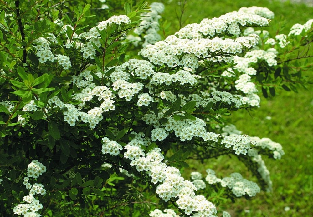 Описание: низкий кустарник с густой распростертой кроной и зелеными листьями. Цветки белые, цветение обильное в V-VI.