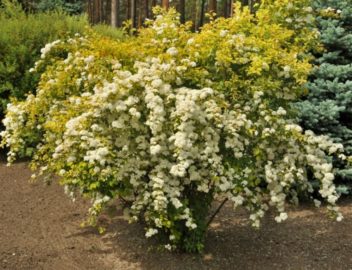 Описание: компактный кустарник с яркой золотисто-желтой окраской листвы весной и в начале лета, позже желтой или желто-зеленой. Цветет во второй половине V ярко-белыми цветками в небольших соцветиях.