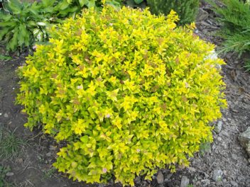 Описание: компактный карликовый кустарник с плотной полукруглой кроной. Листья золотисто-желтые. Цветки светло-розовые, обильные (VI-VII).