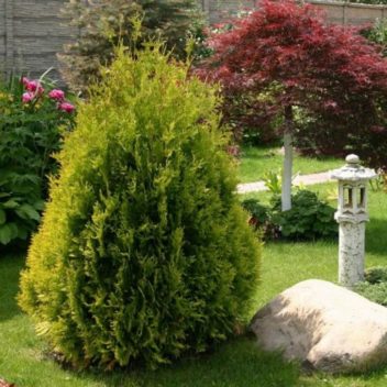Вечнозеленый кустарник с конусовидной формой кроны. Хвоя яркая золотисто-желтая, при распускании - ярко желтая, зимой - бронзовая. К почвам нетребовательна. Теневынослива. Морозостойка. Подходит для одиночных посадок, декоративных групп, бордюров, альпинариев. Зона USDA 4. Форма кроны: ширококоническая. Окрас хвои: золотисто-желтый.